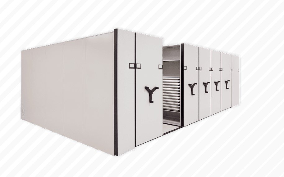 A compact storage system with shelving units mounted on mobile bases that slide on floor rails. It eliminates multiple aisles, providing direct access through one movable aisle — maximizing capacity and saving up to 50% of floor space.